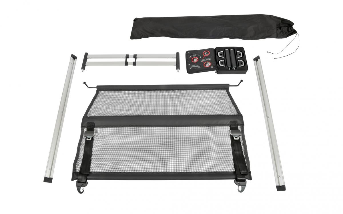 Регулируемая система для надежной транспортировки вещей в багажном отсеке. В комплект входят разделительная сетка багажного отсека, две крепежные направляющие, одна телескопическая штанга, четыре крепежных проушины и одна катушка с ремнем.