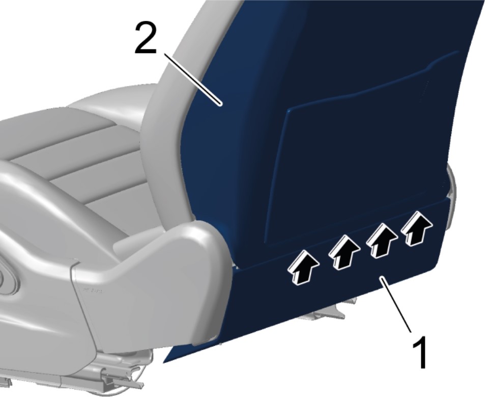 2 С помощью плоского монтажного клина разблокируйте фиксаторы -стрелки- и отсоедините обивку спинки сиденья снизу -1- от накладки спинки сиденья -2-.