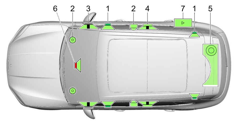 1 Место установки среднечастотного динамика: передняя центральная панель, передняя дверь, задняя дверь и стойка D. Общее количество: 7