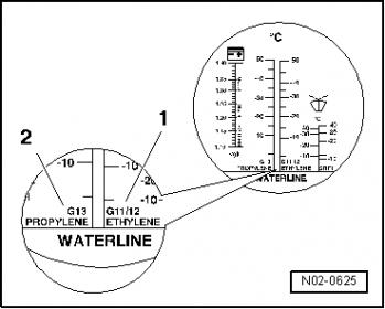 Шкала -1- рефрактометра проградуирована для растворов концентратов G12, G12 Plus, G12 Plus Plus и G11.