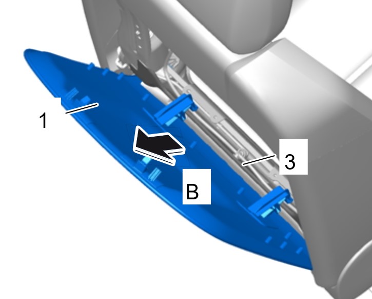 2. Извлечь накладку спинки сиденья -1- из крепления -3- движением наверх -B- .