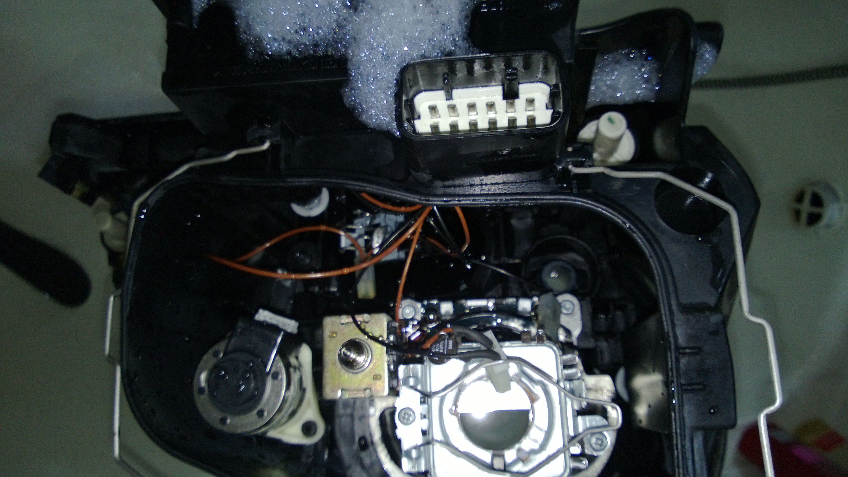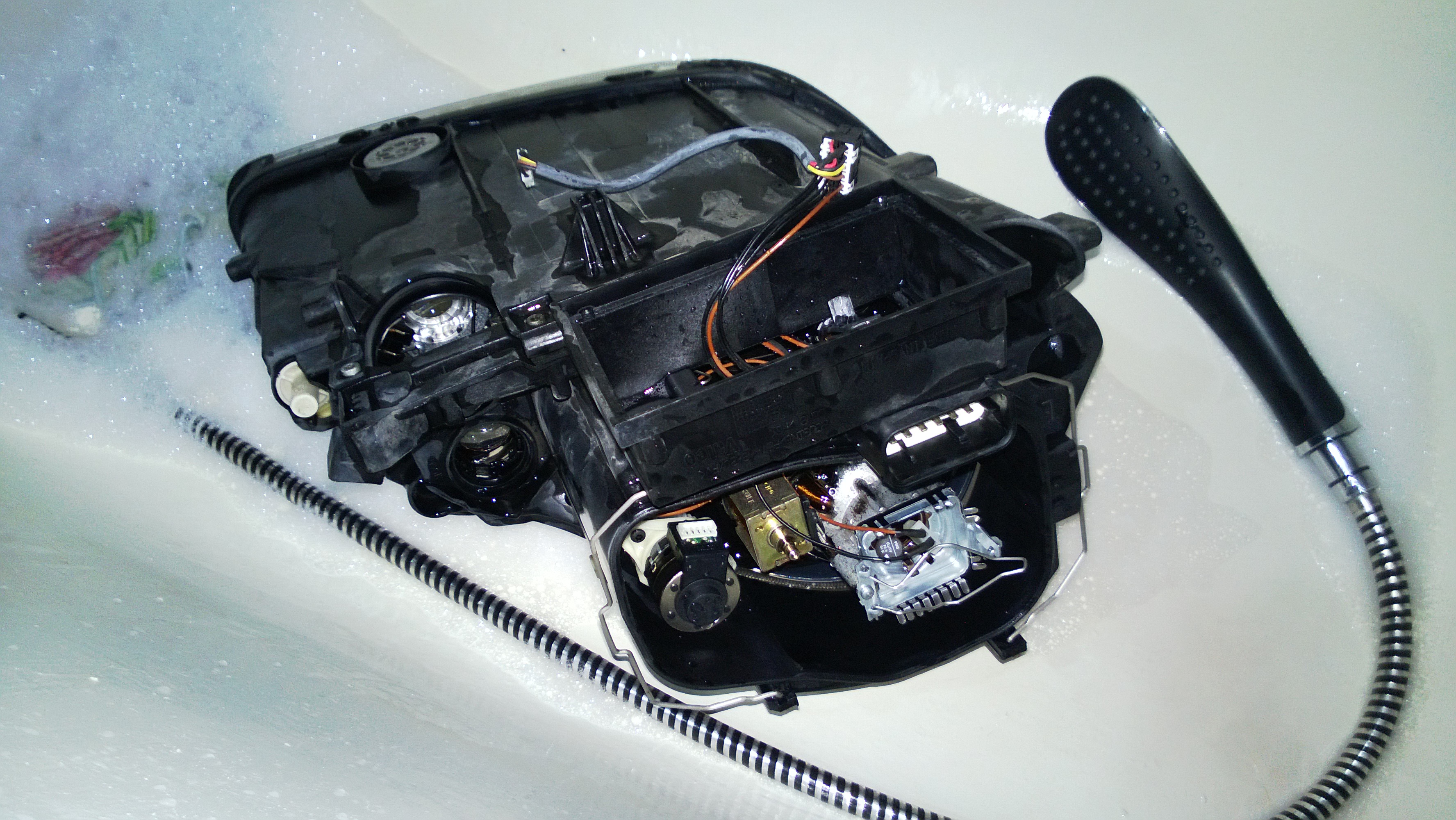 Чтобы этого не произошло нужно залить в фару литр дистилированой воды (покупаем в аптеке). Заливаем воду и полоскаем, сильно тряся. Сливаем воду и повторяем полоскание ещё раз.