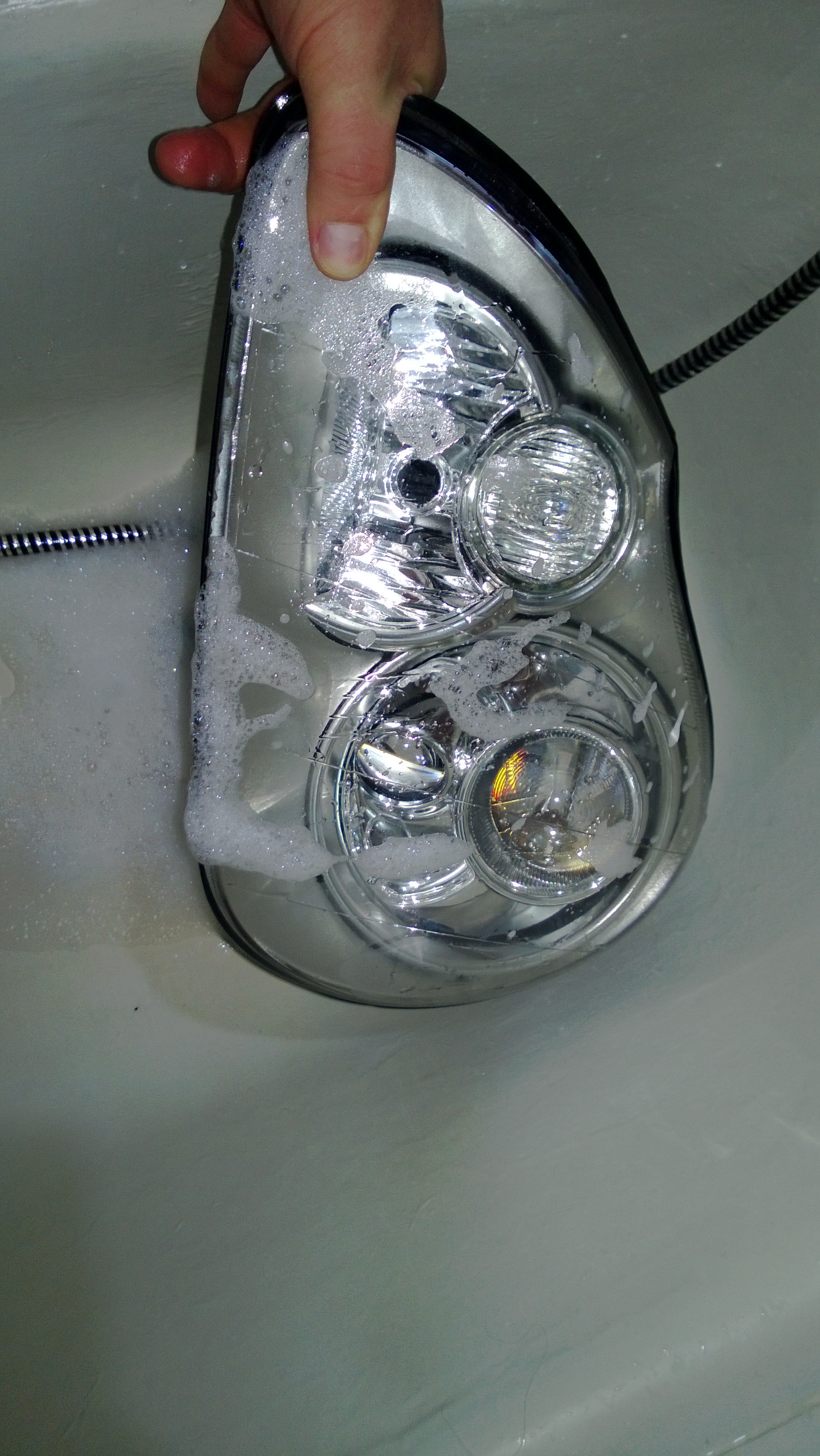 После того, как в фаре не останется моющего средства. Берём всем знакомый Фейри (тот, что для посуды) и повторяем процесс мойки.