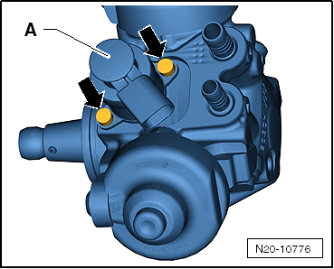 Выкрутить болты -стрелки- и снять клапан дозирования топлива -A- со СТАРОГО насоса высокого давления.