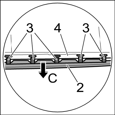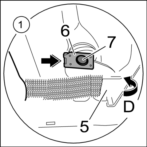 3. Провести удерживающую скобу -6- над штифтом -7- до ее полной фиксации -стрелка C- .