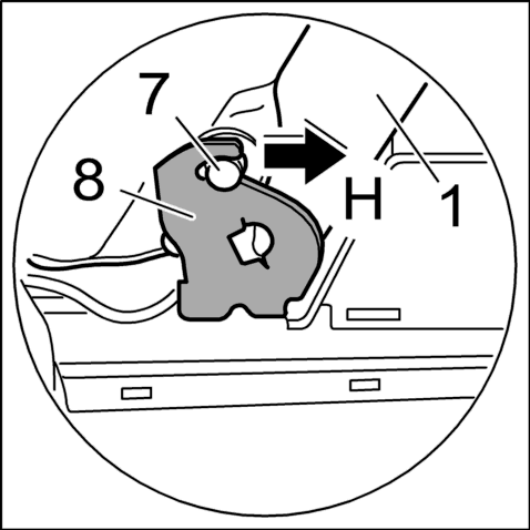 7. Закрыть подлокотник с обивкой -1- примерно на 45° и извлечь вместе с болтом -7- из направляющей -8- -стрелка H- .