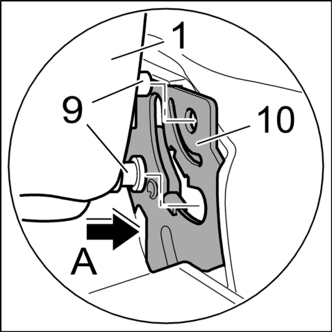 1. Установить задний подлокотник с обивкой: Установить подлокотник с обивкой -1- штифтами -9- в направляющую -10- -стрелка A- .