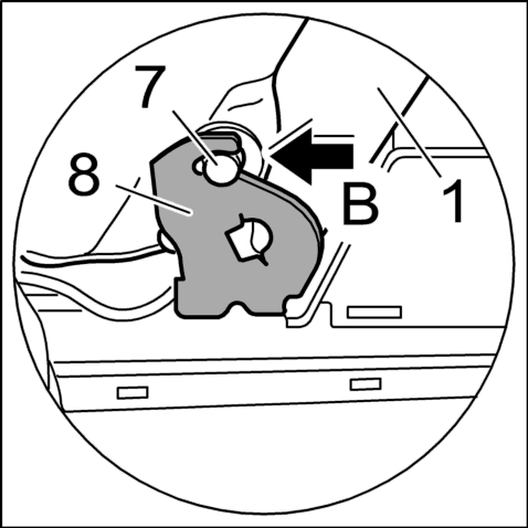 2. Установить подлокотник с обивкой -1- штифтом -7- в направляющую -8- и вставить -стрелка B- .