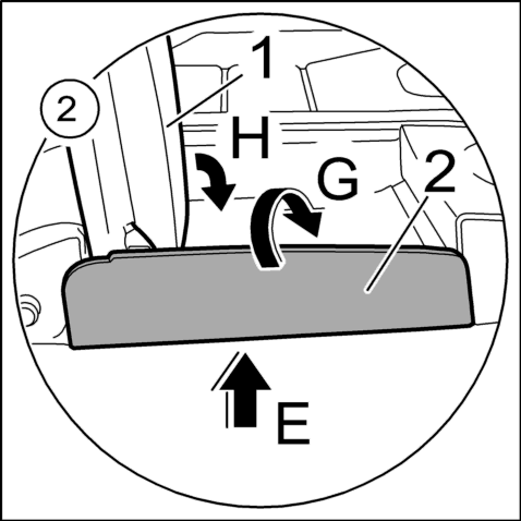 6. Повернуть накладку подлокотника -2- через каркас спинки сиденья -стрелка G- .
