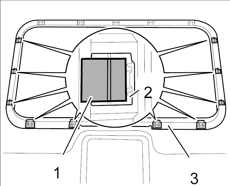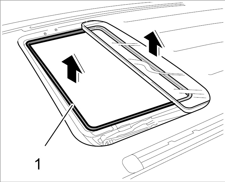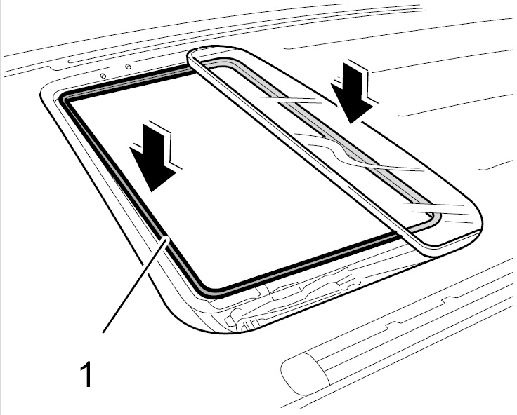7. Позиционировать накладную рамку -1- в проеме сдвижного люка и защелкнуть ее на крепежных скобах -стрелки- .