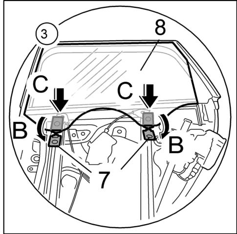 3.2. Элементы крепления -7- открыть ( -стрелки B- ) и извлечь боковое стекло -8- вниз ( -стрелки C- ).