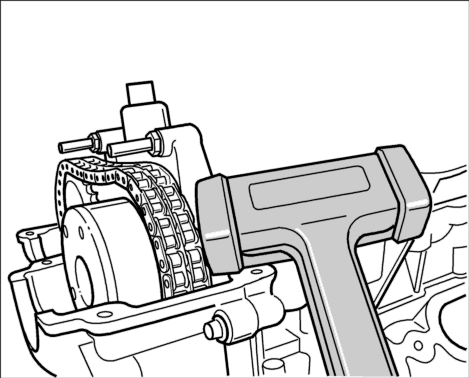 2. Поднять цепь ГРМ и осторожно установить фазовращатель на распредвал. Для увеличения зазора цепи ГРМ повращать звездочку распредвала вперед и назад. Установить цепь ГРМ на фазовращатель.