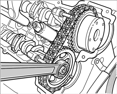 5. Ослабить цепь ГРМ и снять верхнюю пластиковую направляющую с обоих штифтов. Для увеличения зазора между цепью ГРМ и звездочками следует немного ослабить накидным ключом звездочку распредвала → Верхняя пластиковая направляющая цепи ГРМ .