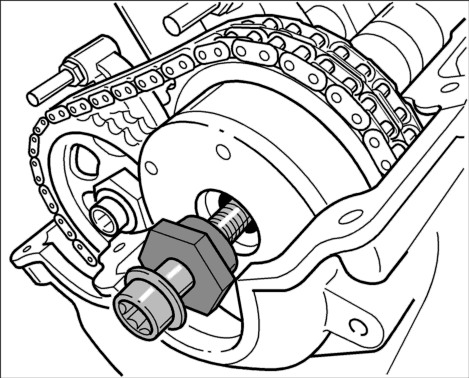 1. Отрегулировать фазы газораспределения. После регулировки фаз газораспределения затянуть звездочки распредвалов и фазовращатели → предв. затяжка: 10 Nm → предв. затяжка: 50 Nm → оконч. затяжка: 135° → предв. затяжка: 10 Nm → предв. затяжка: 50 Nm → оконч. затяжка: 90°.