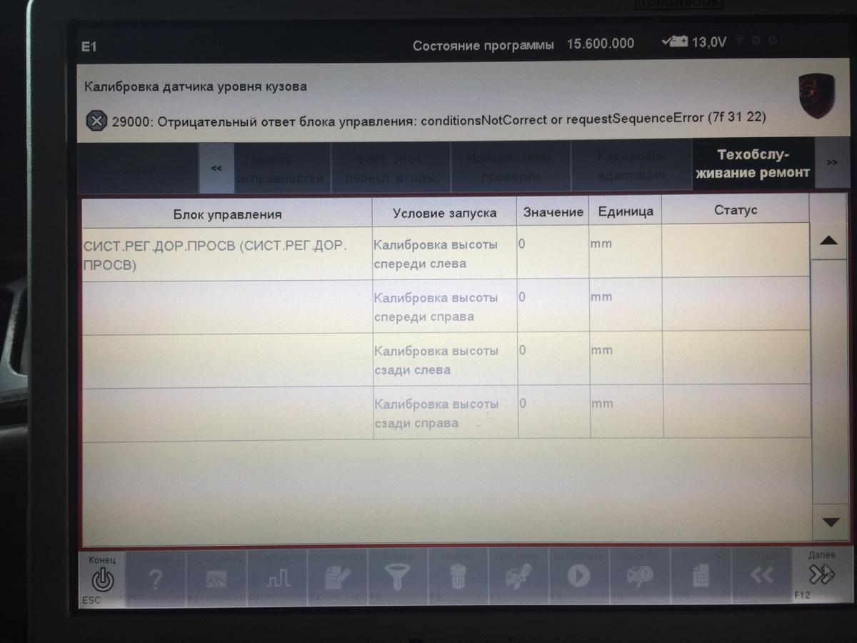 День добрый Владимир,при регулировки пневмы Кайен 2003 г.в. выходят таки е ошибки,меняли блок управление пневмой снятый с рабочей машины,результат тот же