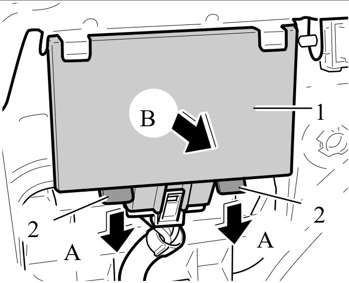 2. Разблокировать кронштейн -2- в обоих зажимах -стрелки A- и блок управления задней крышки -1- из кронштейна -2- извлечь -стрелка B- .