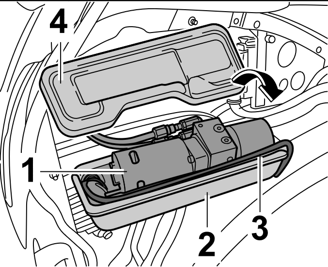 5. Установитьм гидравлический блок -1- в нижней части звукопоглощ. кожуха -2- , проложить жгут проводки -3- и установить верхнюю часть звукопоглощающего -4- кожуха -стрелка- .