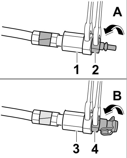 1. Подсоединить напорные масляные магистрали -1 и 2- к гидравлическому блоку -3- - -стрелки- до ощутимых щелчков штуцерных разъемов -4- .