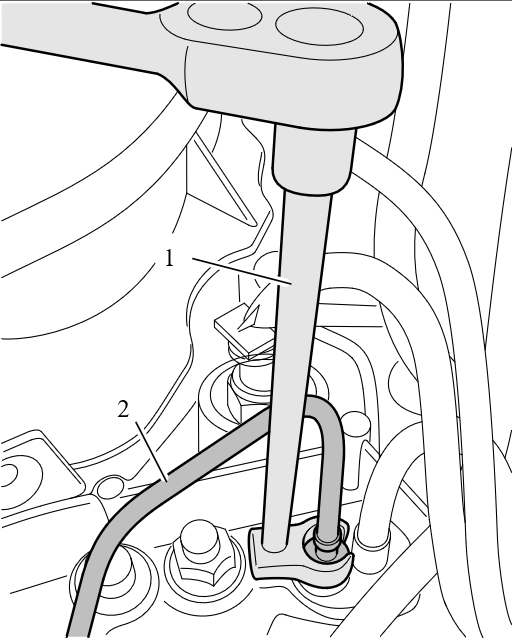 1. Демонтировать декоративную крышку спереди справа над чашкой амортизационной стойки и отсоединить трубопровод передней правой пневматической амортизационной стойки -2- .