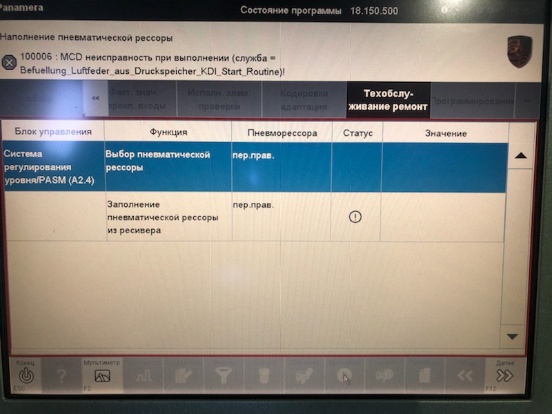 3. По завершении ремонтных работ в обзоре блоков управления выбрать >>Система регулирования дорожного просвета/PASM<<>>Обслуживание/ремонт<<>>Замена одного пневмоэлемента<< и >>Наполнить<<. Следовать указаниям системного тестера Porsche.