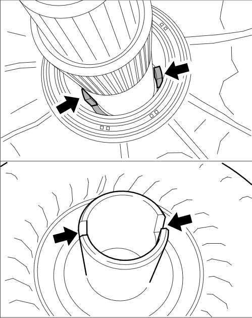 Перед монтажом выровнять гидротрансформатор таким образом, чтобы канавки гидротрансформатора совпадали с канавками захвата -стрелки- .