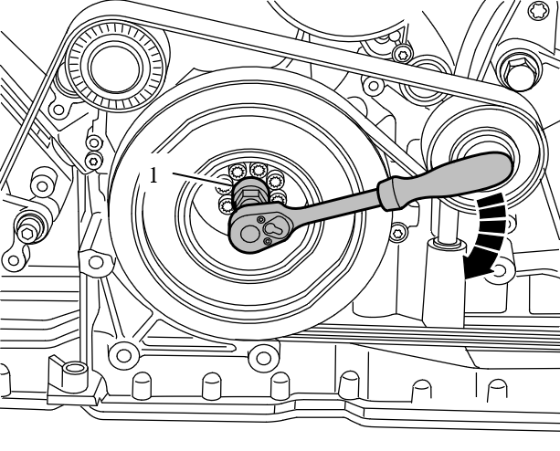 3. С помощью адаптера -1- провернуть коленчатый вал до “ВМТ” в -направлении стрелки- .