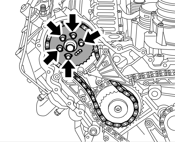 1. Если один из распределительных валов не стопорится, отвернуть все крепежные винты -стрелки- соответствующей звездочки распределительного вала примерно на один оборот.