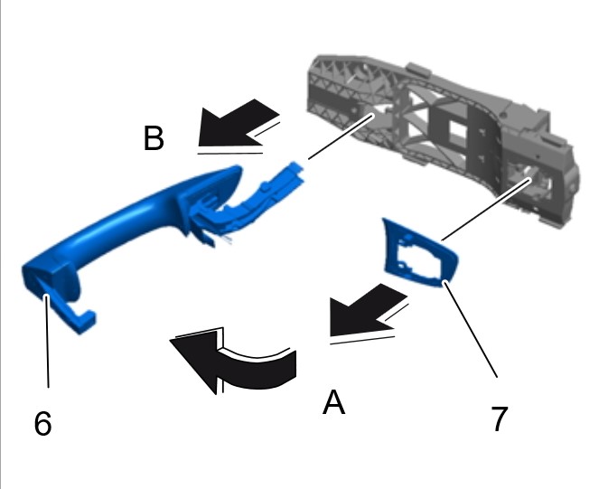 2.2. Вставить ручку передней двери со стороны водителя -6- во внутреннюю часть -B- .