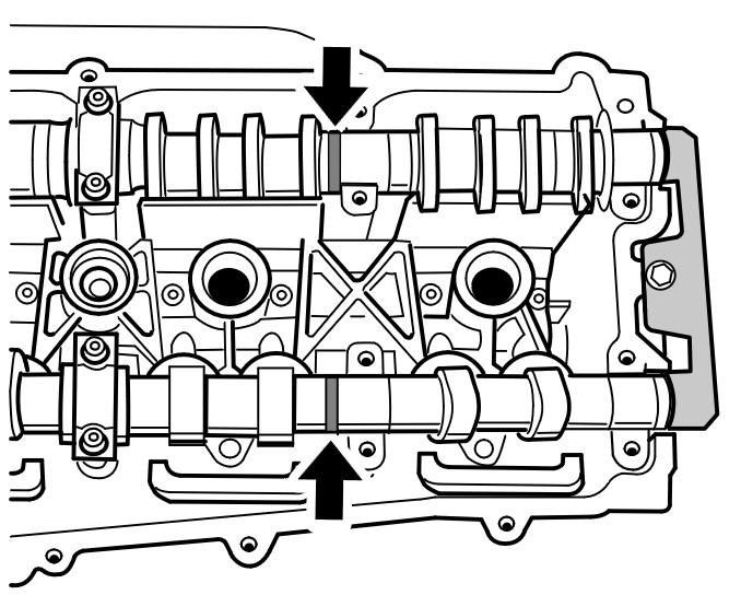 4. Если демонтируются распредвалы стороны цилиндров 1–3, то меньшие сектора на пазах впускного и выпускного распредвалов -стрелки- на цилиндре 1 должны быть направлены к крышке ГБЦ. Для стороны цилиндров 4–6 соответственно - положение на цилиндре 4. Проверить положение с помощью регулировочного шаблона .