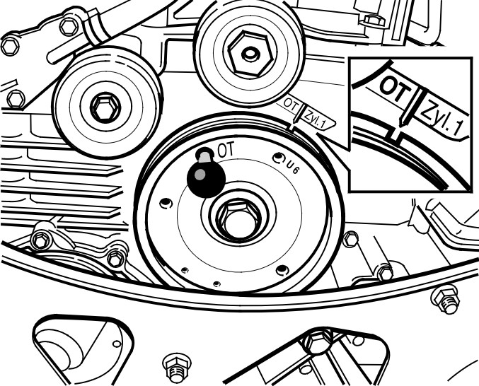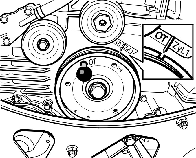 1. Чтобы определить зазор цепи ГРМ следует прокрутить коленвал за ременный шкив или гаситель колебаний по часовой стрелке (направление вращения двигателя) до угла 60° перед ВМТ, маркировка U6 на ременном шкиве/гасителе колебаний совпадет со стопорным отверстием на картере двигателя. Зафиксировать с помощью фиксирующего штифта.