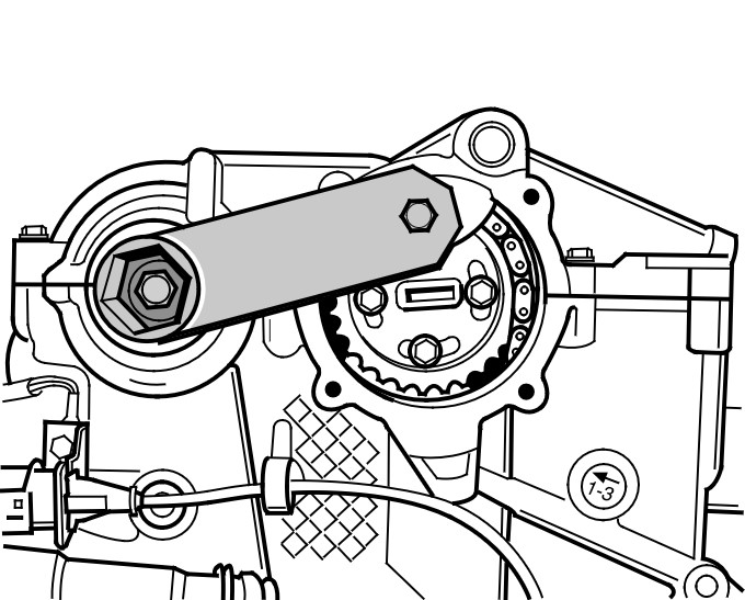 18. Закрепить центральный болт элемента фазовращателя. Установить специнструмент удерживающий инструмент  на шестигранник промежуточного элемента центрального болта. Слегка прокрутить центральный болт рукой так, чтобы инструмент все еще прилегал к установочному отверстию маслооткачивающего насоса. Зафиксировать шестигранный болт на инструменте.