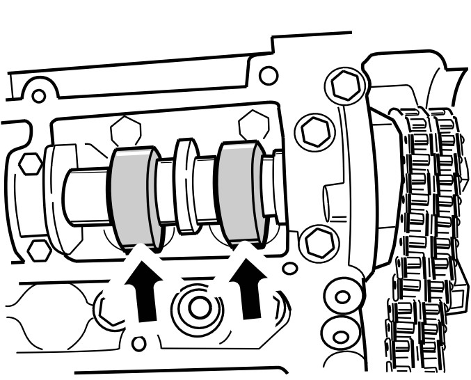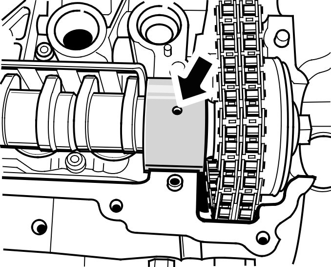 12. Снять распредвалы. Извлечь выпускной распредвал, снять цепь привода ГРМ с фазовращателя впускного распредвала и извлечь распредвал. Положить цепь привода ГРМ в кожух цепи в ГБЦ.