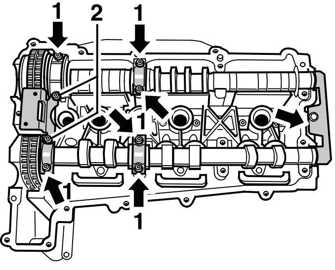 10. Установить 8 болтов крышки подшипника (Torx) : 6 M6 x 35 -1- и 2 M6 x 40 -2- для подшипников распредвалов и направляющей шины. Болты наживлять равномерно и без лишних усилий.