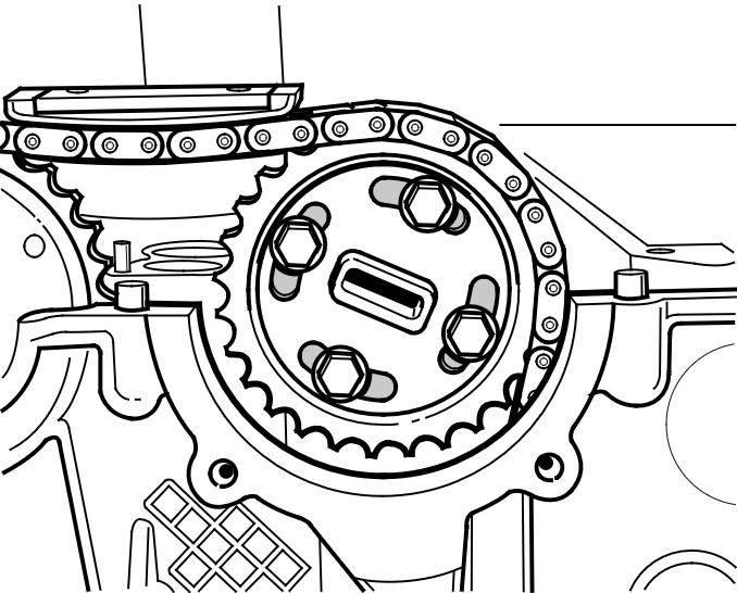 7. Ослабить четыре болта Torx M6x16 на звездочке соответствующего выпускного распредвала. Звездочку не снимать.