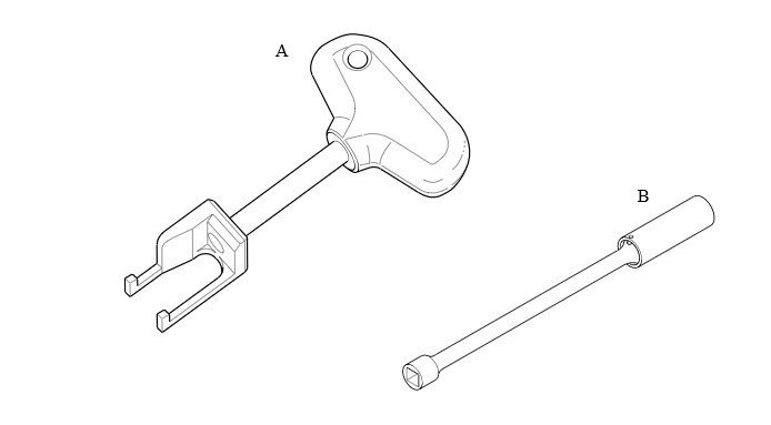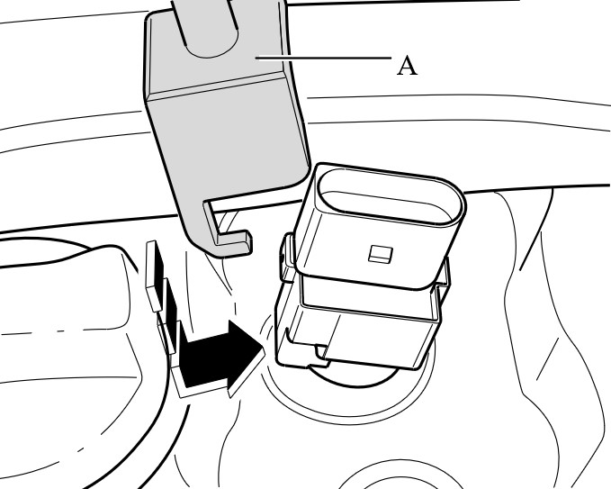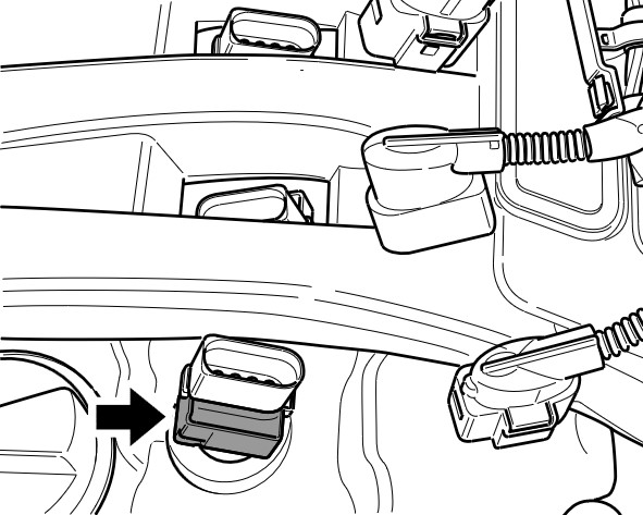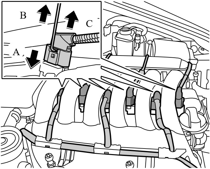 Отсоединить 6 катушек зажигания от жгута проводов. Для этого слегка отжать разъемы вниз -стрелка A- , разблокировать с помощью подходящего вспомогательного приспособления (например, изогнутый кусок проволоки) -стрелка B- и отсоединить -стрелка C- .