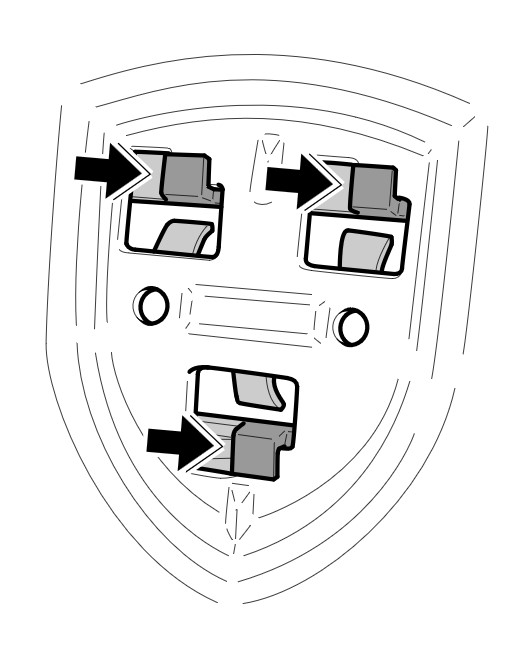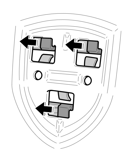1. Установить крепеж герба сзади в облицовку передней части кузова и переместить его вправо -стрелки- .