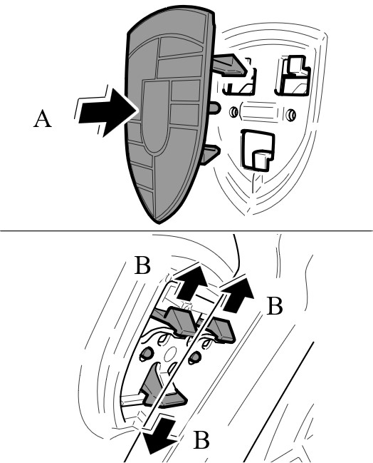 2. Вставить герб в облицовку передней части кузова -стрелка A- , пока фиксаторы отчетливо не сработают -стрелки B- .
