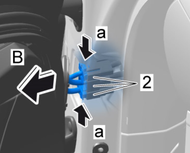 2. Разблокировать электрические разъемы -2- в месте разъединения -a- , отсоединить их и просунуть вместе с резиновой втулкой через отверстие -B- .