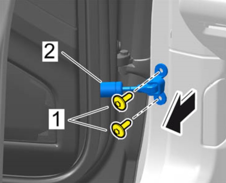 4. Вывернуть крепежные винты -1- фиксатора двери и снять фиксатор двери -2- на стойке A.