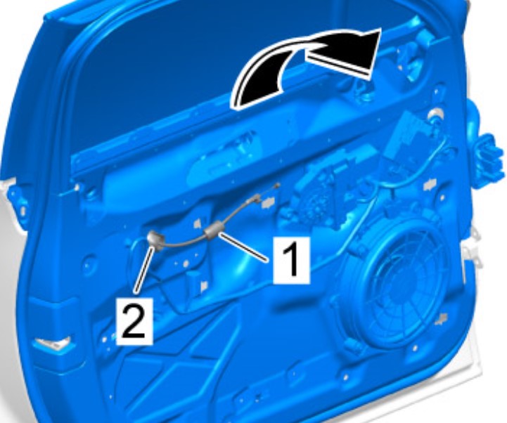 10. Провести трос привода -1- ручки открывания двери с резиновой втулкой -2- через отверстие.
