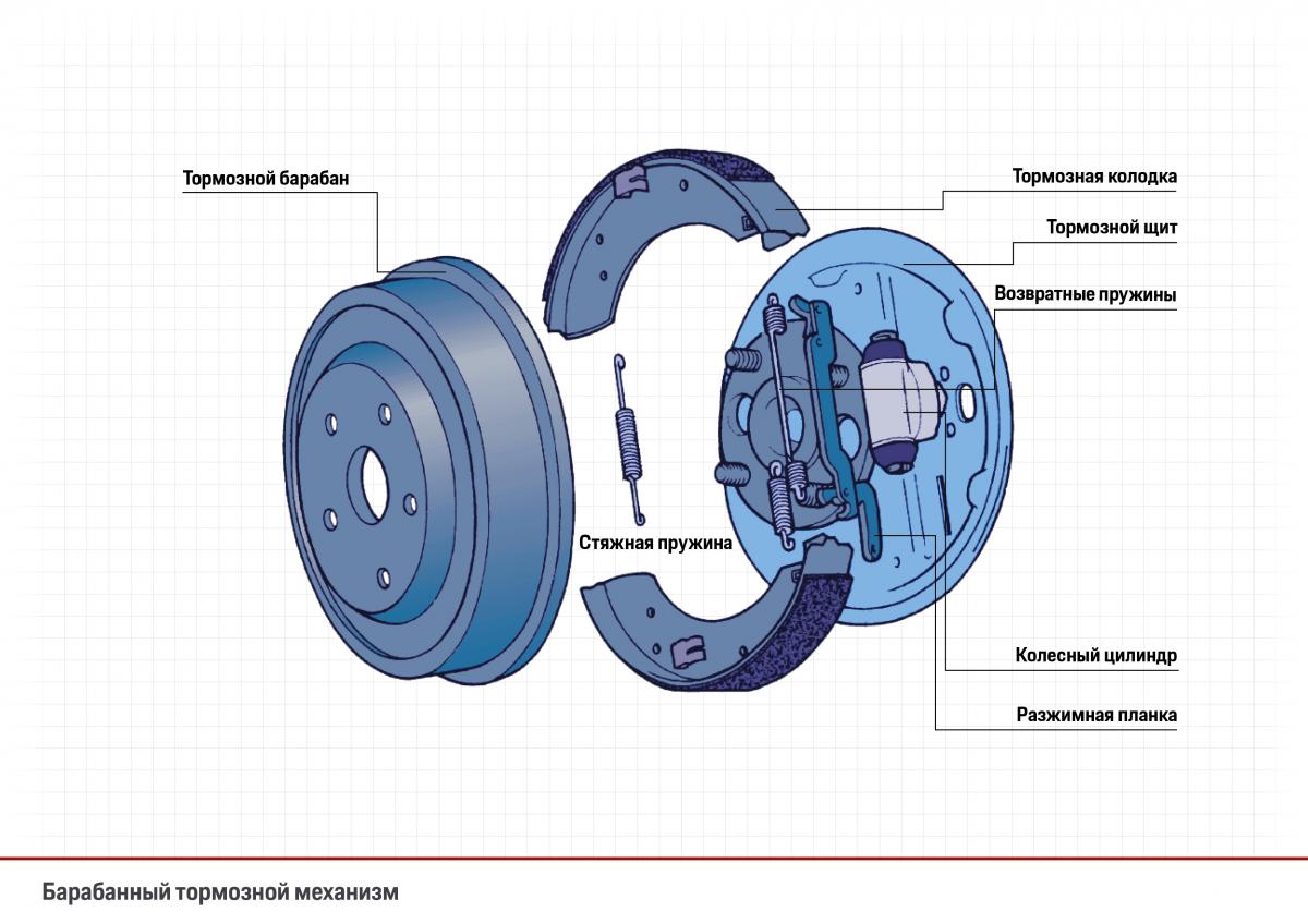 Барабанный тормозной механизм состоит из тормозного барабана, тормозных колодок, зажимного устройства и тормозного щита. Щит крепится к подвеске колеса. При торможении зажимное устройство прижимает тормозные колодки с накладками к тормозному барабану, создавая необходимое трение. Трение создает крутящий момент, за счет которого тормозная колодка втягивается в барабан, усиливая тормозной эффект. В этом самоусилении заключается главное преимущество барабанного тормозного механизма.