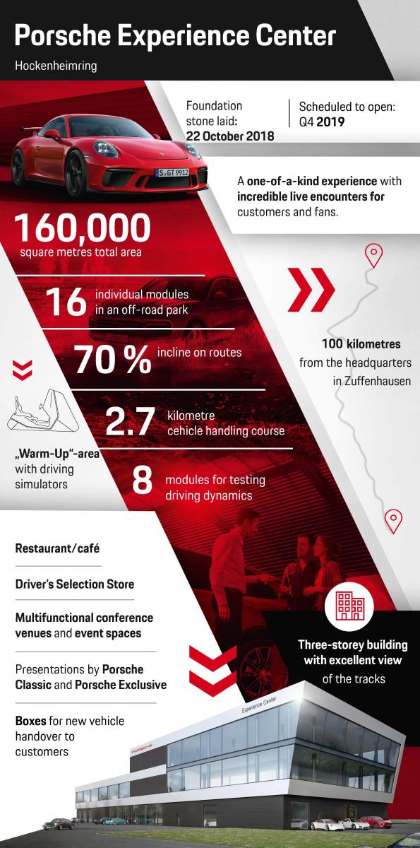 Первый спортивно-развлекательный Porsche Experience Center был открыт в Лейпциге в 2002 году на территории завода. Затем последовали Сильверстоун (Великобритания, 2008 год), Атланта (США, 2015 год), Ле-Ман (Франция, 2015 год) и Лос-Анджелес (США, 2016 год). В апреле 2018 года к ним добавился центр в Шанхае (Китай). Проект центра на Хоккенхаймринге включает в себя несколько трасс и участков для самых разных тренинговых программ. Трасса протяженностью 2,7 километра со сложным профилем предоставляет возможность для отработки навыков управления автомобилем. Дополняют трассу специальные сектора, такие как площадки с влажным покрытием, симулятор дрифта и три кольцевых участка. Внедорожный парк на площади 5200 квадратных метров предлагает 16 отдельных секторов с характерными для сложного бездорожья условиями, подъемами до 70 процентов, боковыми кренами, камнями, канавами и уложенными под разными углами стволами деревьев.
