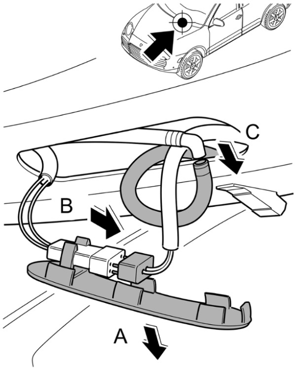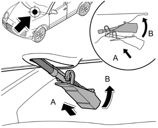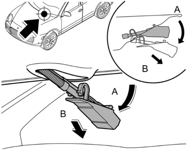 1 Форсунку с каналами вставить в крышку моторного отсека -стрелка A- и зафиксировать -стрелка B-.