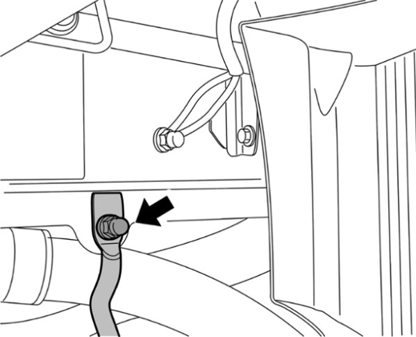 2 Отвернуть крепежный винт массового провода двигателя на балке рамы справа спереди (доступен через правую колесную нишу).