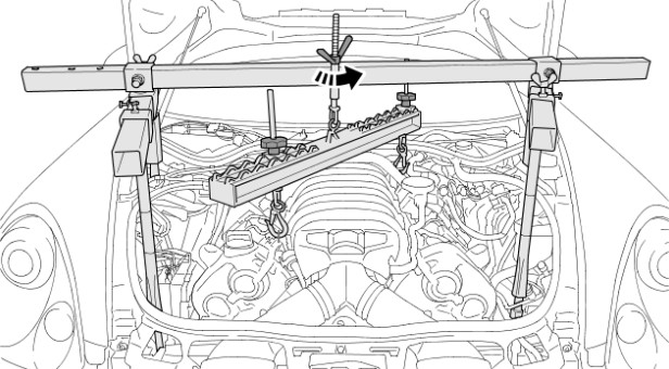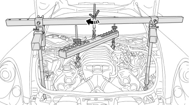 6 Повернуть винт-барашек приспособления для вывешивания вправо и поднять двигатель в первоначальное положение.