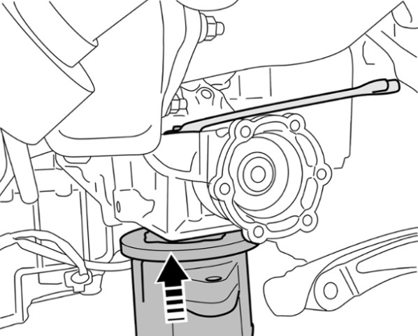 3 Нажать на опору двигателя снизу и затянуть крепежную гайку опоры двигателя (использовать открытый накидной ключ размером 18).