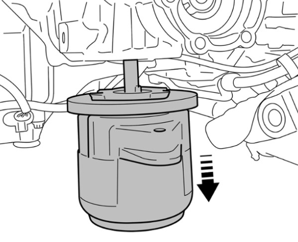 6 Нажать на опору двигателя снизу и отвернуть крепежную гайку опоры двигателя.