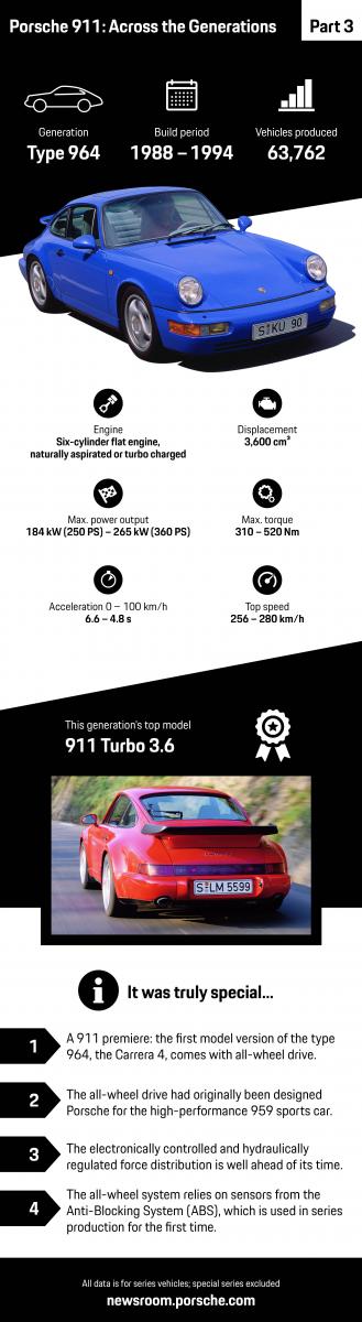 На вершине модельного ряда 911 серии 964 были варианты с турбонаддувом. Оснащенный 3,3-литровым двигателем от своего предшественника, 911 Turbo теперь развивал 320 л.с., а 911 Turbo S выдавал внушительную мощность 381 л.с. Начало 1993 года ознаменовалось переходом на новый 3,6-литровый двигатель с 360 л.с. С октября 1993 года эстафету принимает новый преемник – эволюция легендарного спортивного автомобиля продолжается. Всего за период с 1988 по 1994 год было выпущено 63 762 автомобиля серии 964.