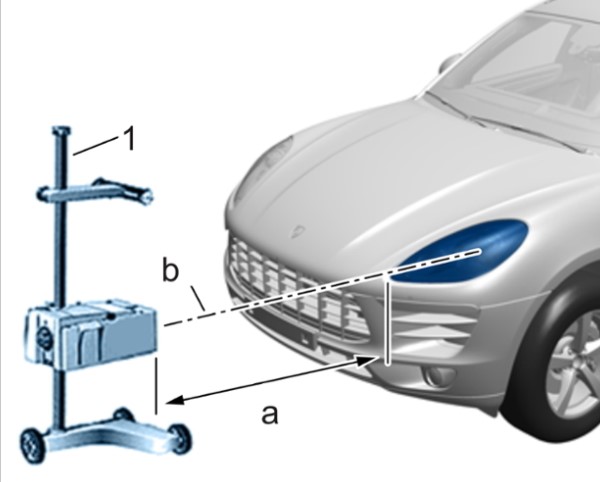 1 Выровнять прибор для регулировки фар -1- под углом 90° к продольной оси автомобиля и расположить на расстоянии -a- Длина 300 mm + 300 mmот левой головной фары.