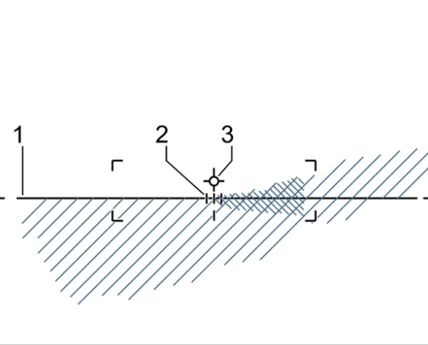 4.2 Точка преломления -2- горизонтальной части и правой поднимающейся части светотеневой границы должна лежать на проходящих через центральную отметку -3- вертикалях. При этом светлая сердцевина светового пучка лежит справа от этих вертикалей.